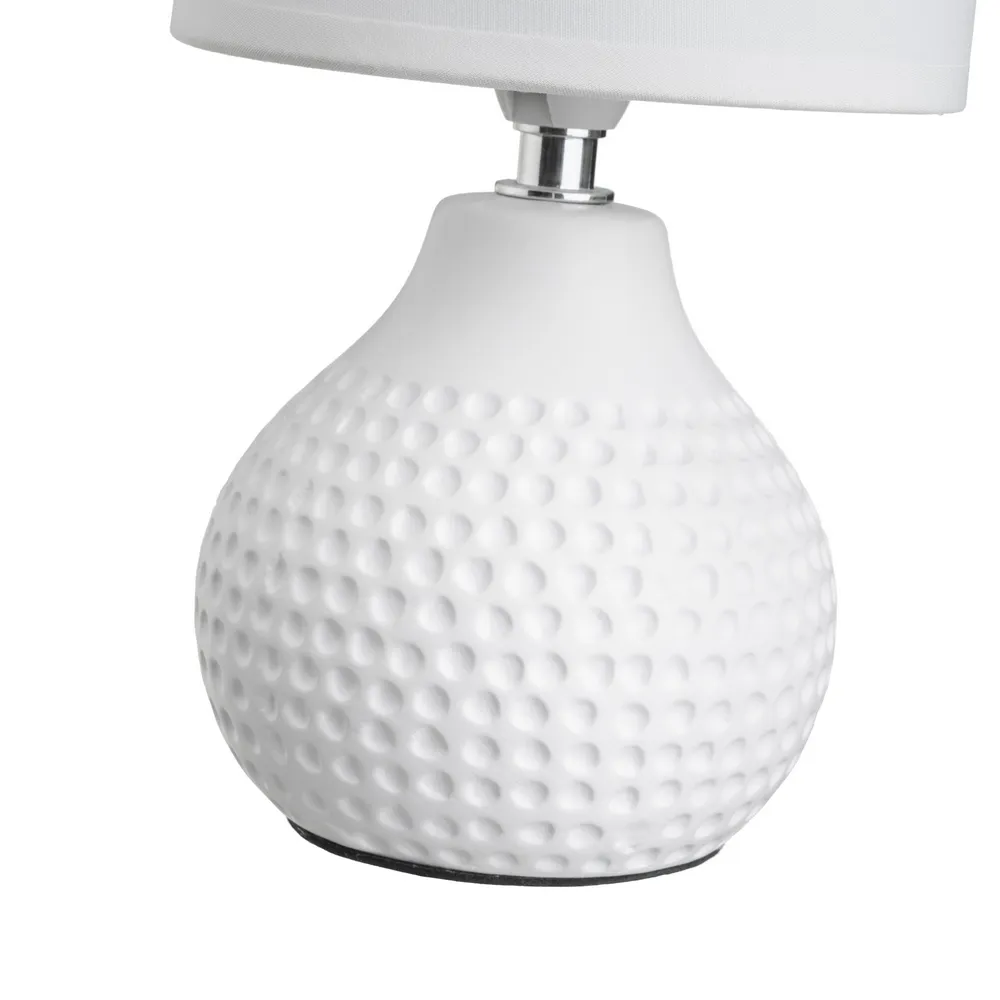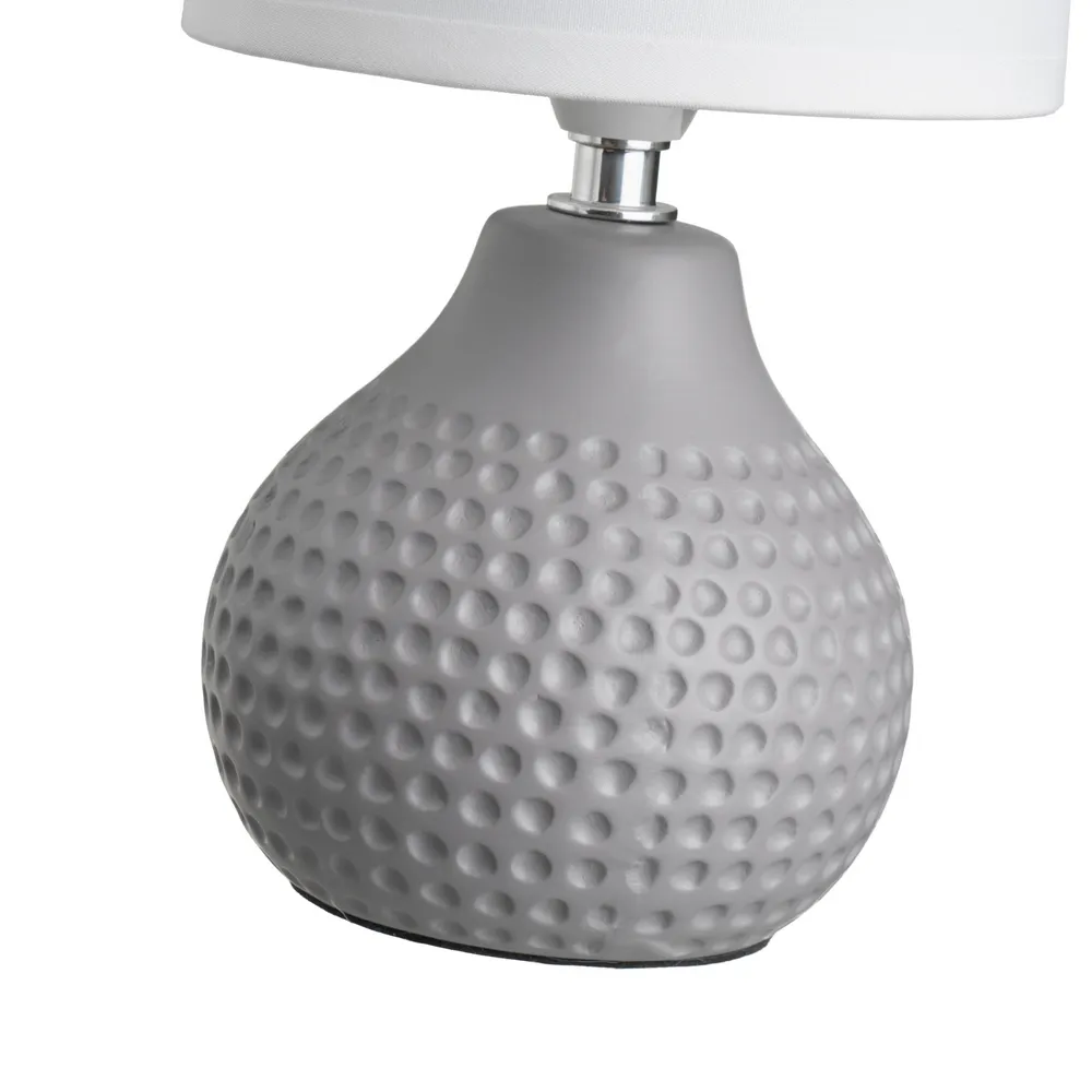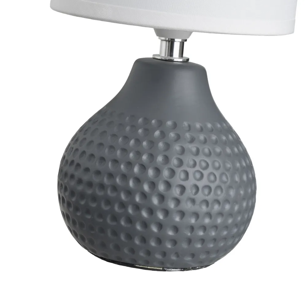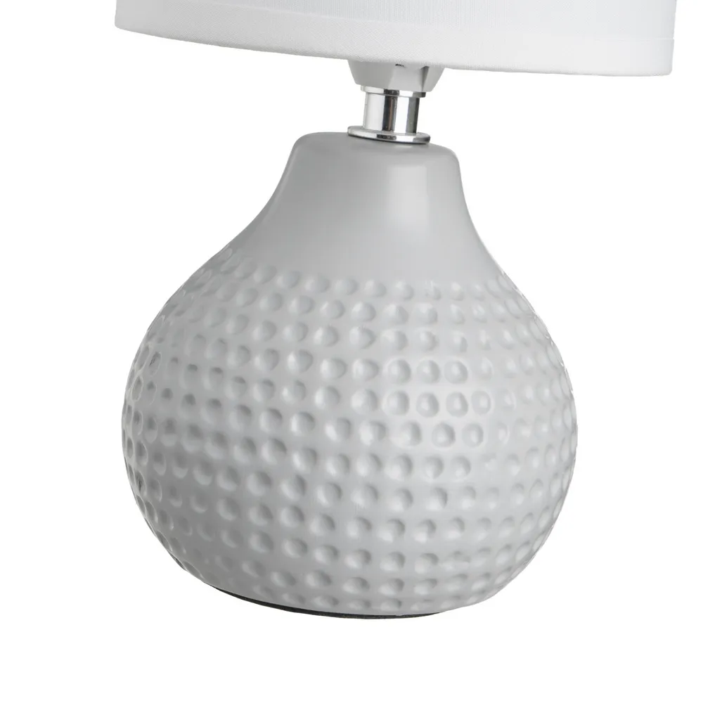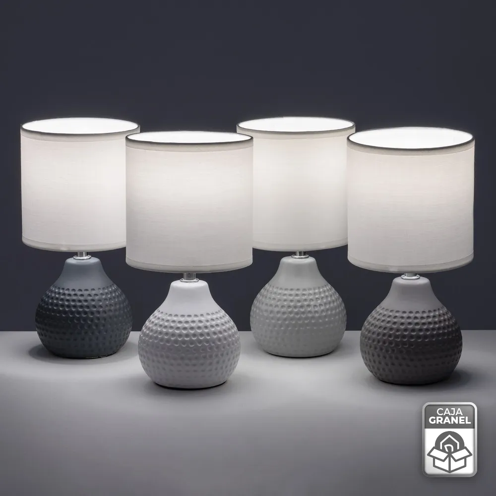 BLANCO, GRIS CLARO, GRIS MEDIO, GRIS OSCURO. CASQUILLO: E14 – MAX 40W. CABLE BLANCO. LONGITUD: 110 CM CON INTERRUPTOR EN EL MISMO CA BLE. BASE: 11X11X10 CM. PANTALLA BLANCA DE TELA TC Y PVC. MEDIDA PANTALLA: 13X13X13 CM. NO INCLUYE BOMBILLA. ESTE ARTÍCULO PASA EL TEST RELACIONADO CON LAS NORMATIVAS EN60598 Y ROHS 2011/65/EU.